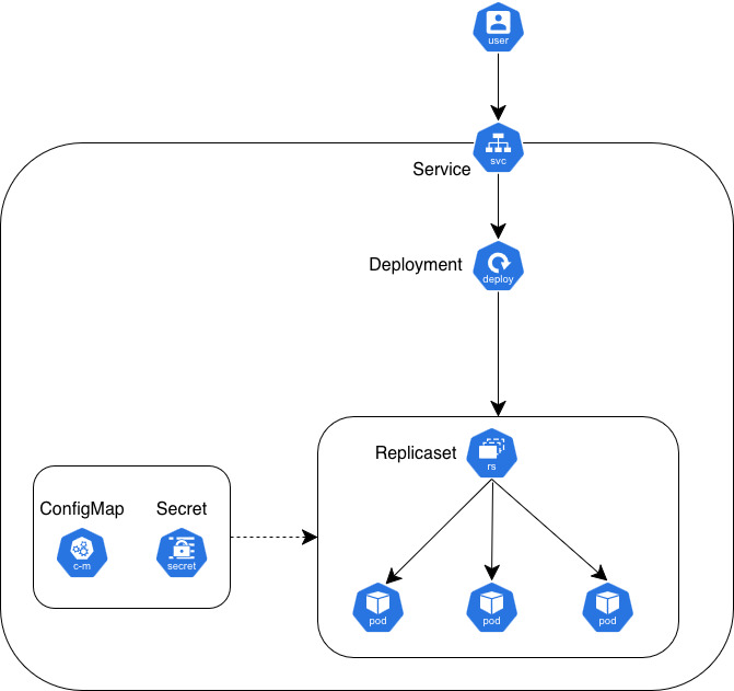 詳しいことはこの後説明しますが、アプリに必要な設定はConfigMap、パスワード等の情報はSecretに書き、それぞれの情報をReplicaset配下のPodに読み込ませるという構成です。また、このアプリについては、Serviceを通してユーザに公開されます。